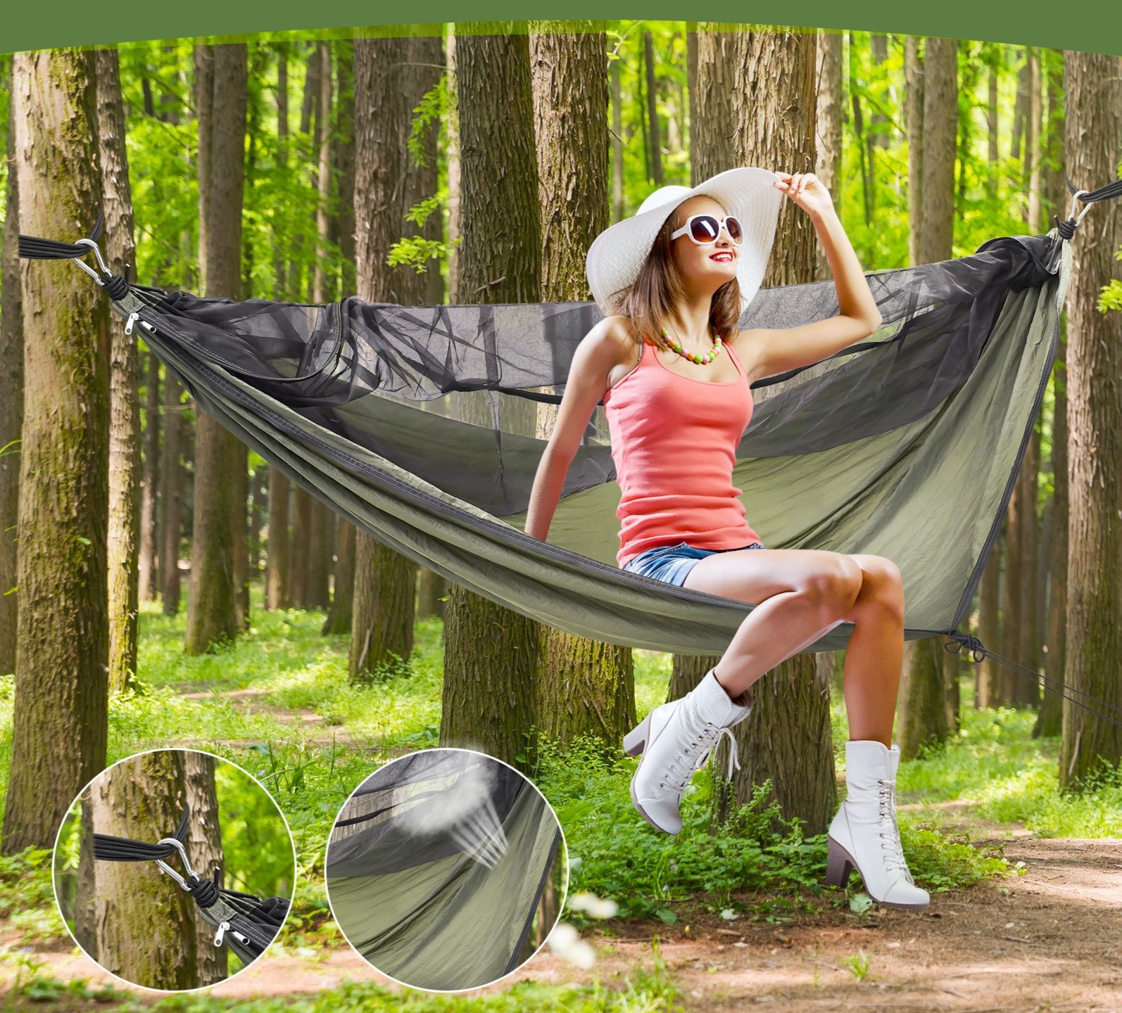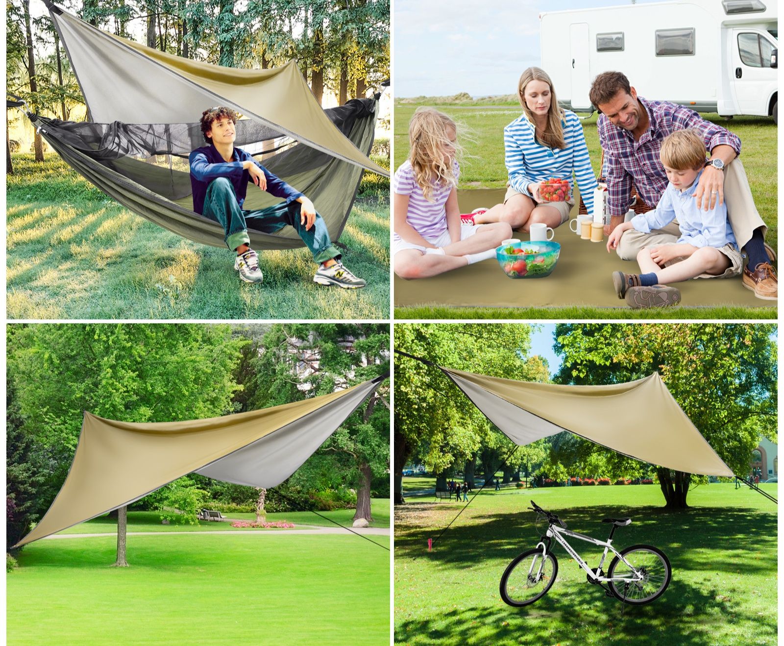 森林でのキャンプに最適なハンモックと日除け布のセットです。