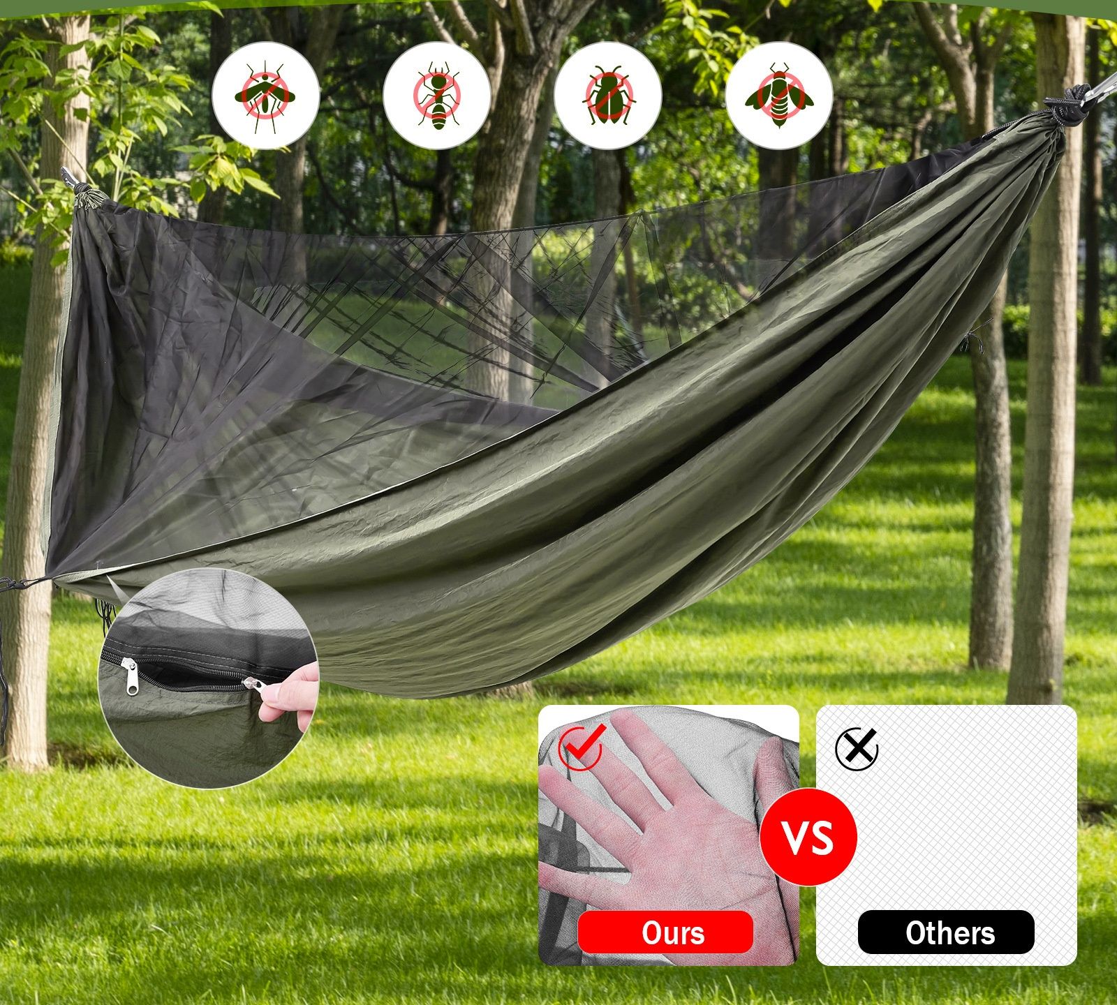 虫除けの蚊帳が一体となったハンモックは快適な睡眠空間を提供します。