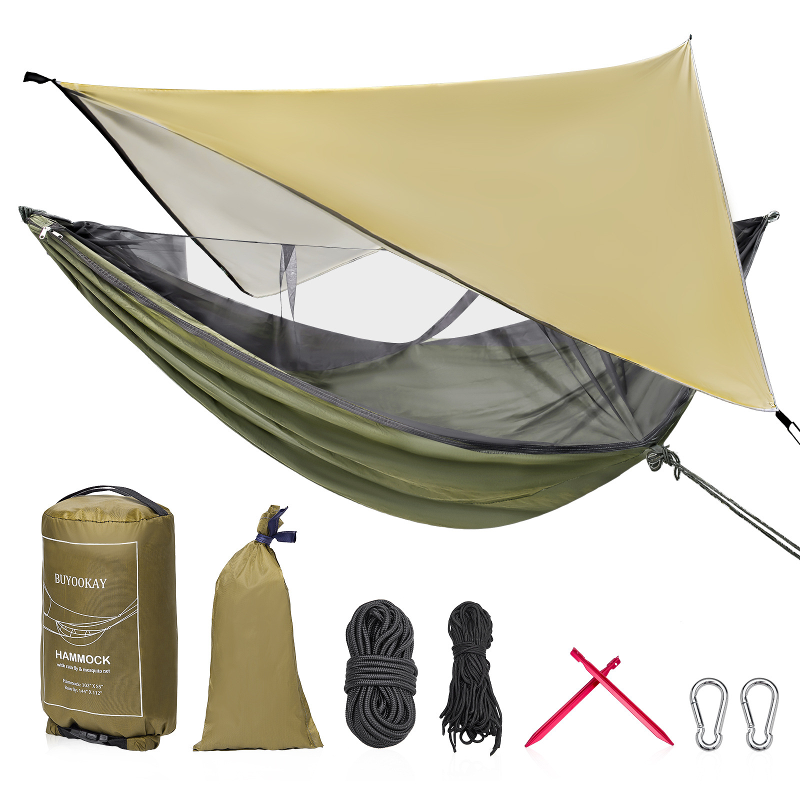 設営用のロープやペグ、金具が全て付属しており、初心者でも簡単に組み立てられます。