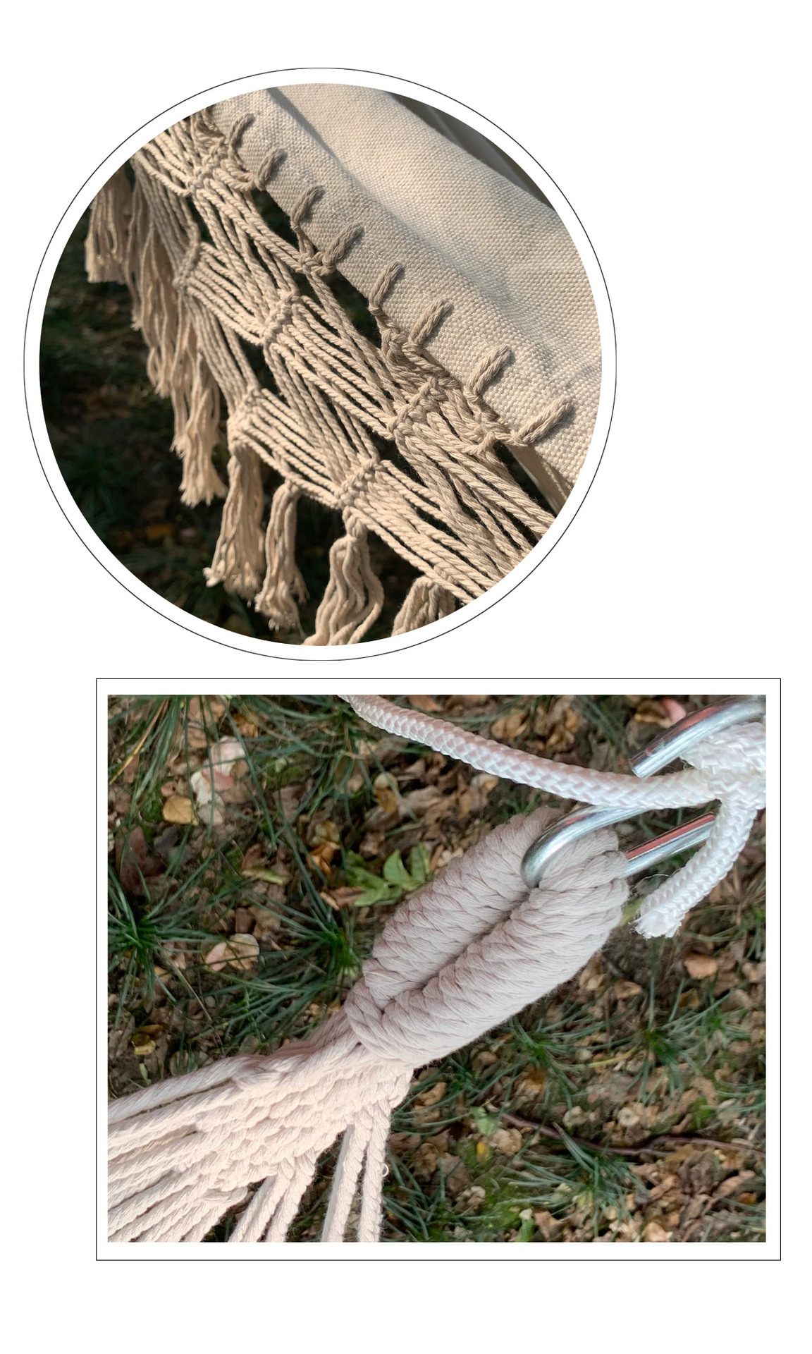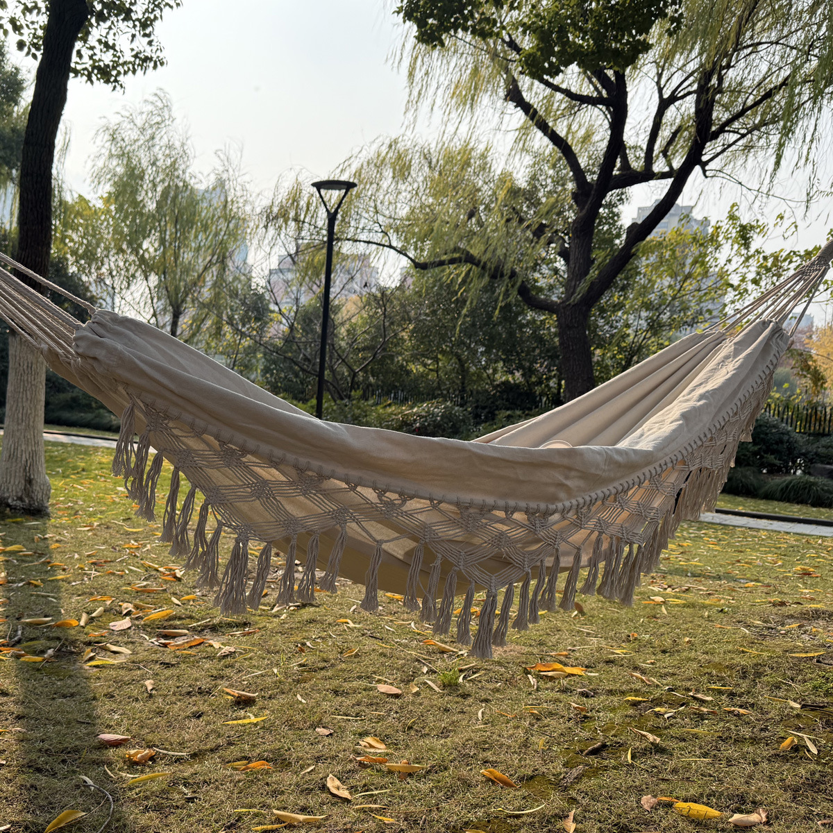 繊細なマクラメ編みと優雅なフリンジが特徴の吊り下げ式ハンモックです。