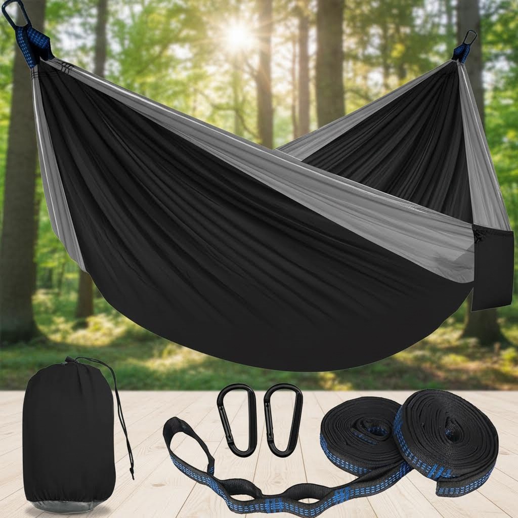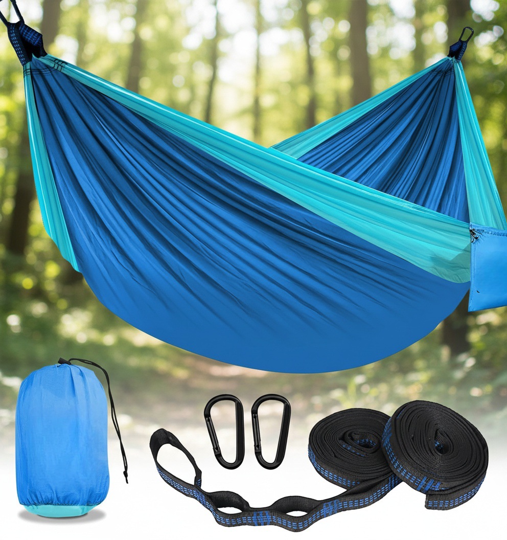 付属のストラップと金具を使えば、木に吊るすだけで快適な休息空間が完成します。